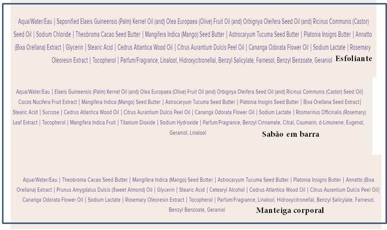Esse meu é de Manteiga de Manga Rosa (umectante e protetora, restaura a flexibilidade da pele), Bacuri ( alto poder de nutrição), Tucumã (alto poder de hidratação, anti-inflamatória e ajuda no brinzeamento), e Extrato de Urucum (antioxidante, antirrugas, protege dos raios ultravioleta)