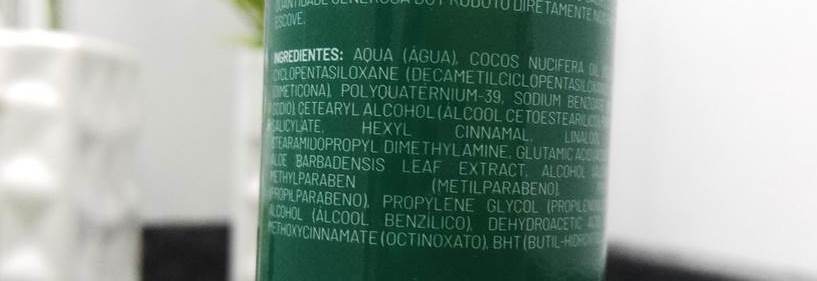Aqua (Água), Cocos Nucifera Oil (Óleo de Coco), Ciclopentasiloxane (Decametilciclopentasiloxano), Dimethicone (Dimeticona), Polyquarternium-39, Sodium Benzoate (Benzoato de Sodio), Cetearyl Alcohol (Álcool Cetoestearílico), Parfum, Benzyl Salicylate, Hexyl Cinnamal, Linalool (Essência), Stearamidopropyl Dimethylamine, Glutamic Acid (Ácido Glutâmico), Aloe Barbadensis Leaf Extract, Alcohol (Álcool Etílico), Methylparaben (Metilparabeno), Propylparaben (Propilparabeno), Propylene Glycol (Propilenoglicol), Benzyl Alcohol (Álcool Benzílico), Dehydroacetic Acid, Ethylhexyl Methoxycinnamate (Octinoxato), BHT (Butil-Hidroxitolueno).