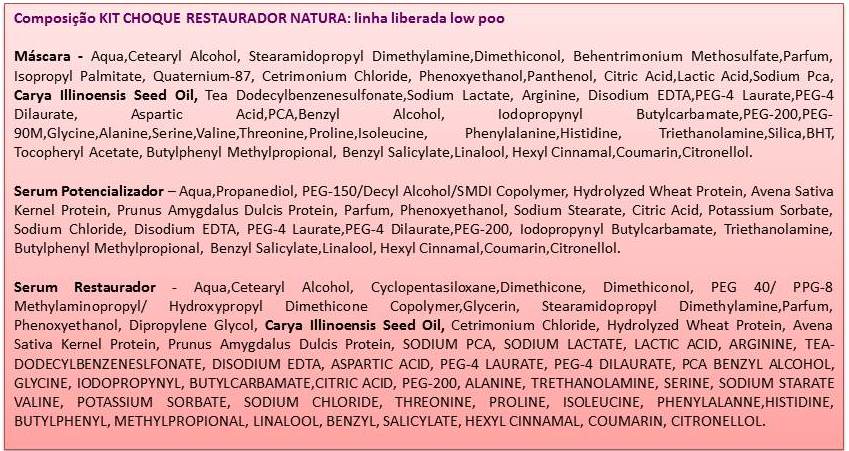 - Sérum restaurador: silicones, Glicerina (hidrata), Óleo de noz Pecã, proteínas vegetais e complexo com 9 aminoácidos.