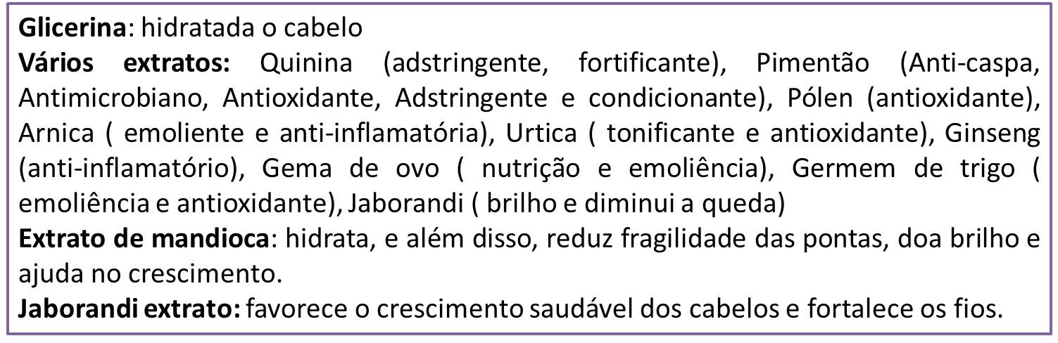 - Jaborandi: favorece o crescimento saudável dos cabelos e fortalece os fios.