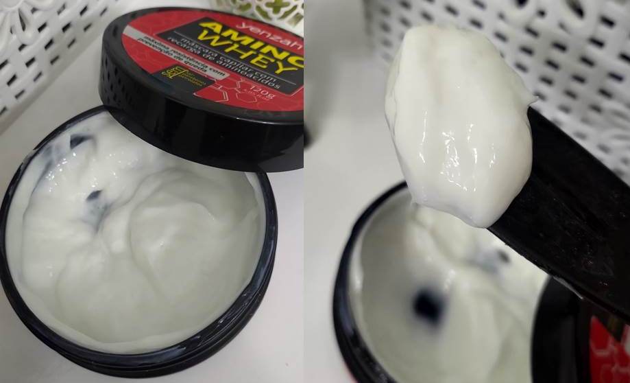 Máscara branca com textura média contudo, mais para molinha. O perfume é floral e doce, não muito forte. Meu frasquinho é de 120 g, paguei 18,90.