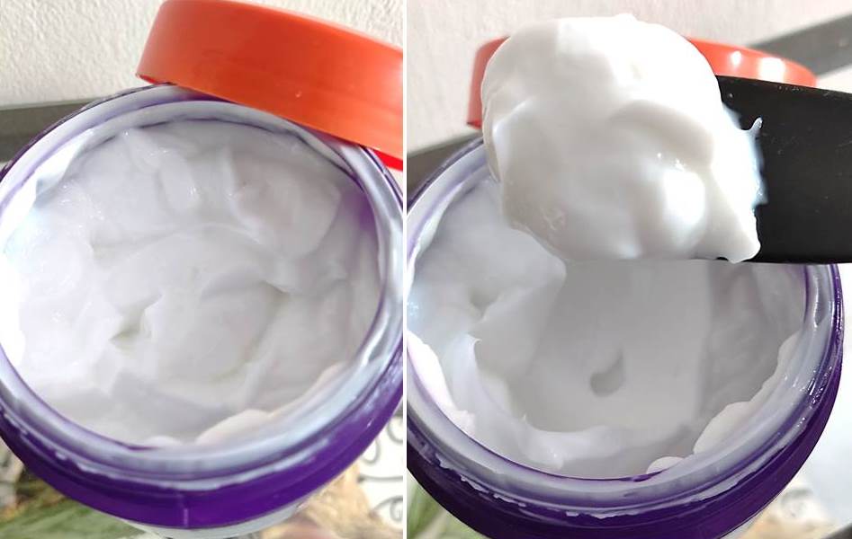 Descrição: máscara com textura média, de cor branca, e um perfume gotoso, docinho e frutado. Pote com 300 g paguei 15,90.