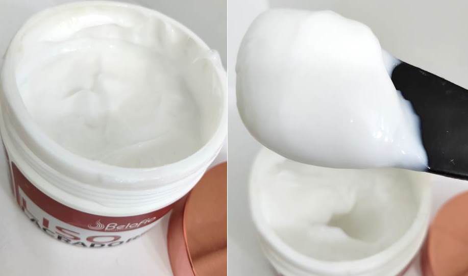 - Máscara: branca, consistência média. Perfume igual do shampoo. O pote vem com 500 g.